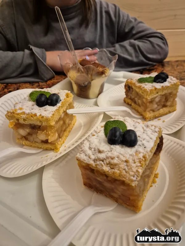 Absolutnym hitem jest kultowa szarlotka, która świetnie motywuje dzieci do marszu. Polecamy również regionalny krem bryndzowy – jest genialny i bardzo rozgrzewający, a także zupę pomidorową oraz tiramisu.