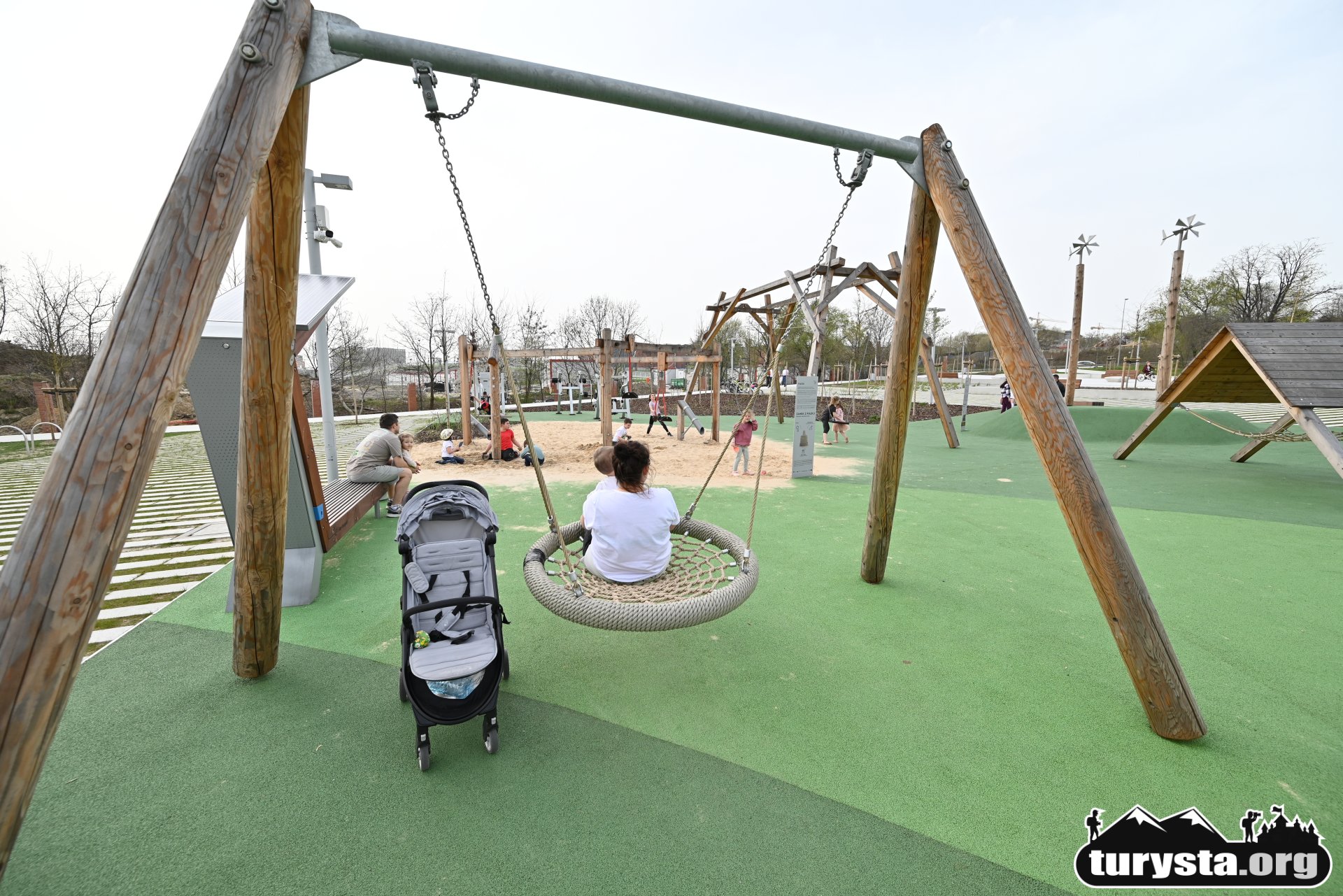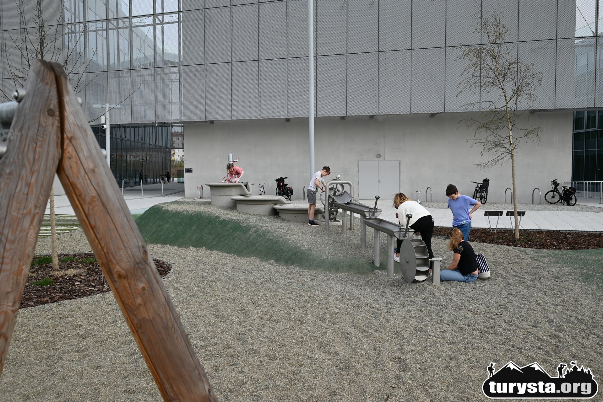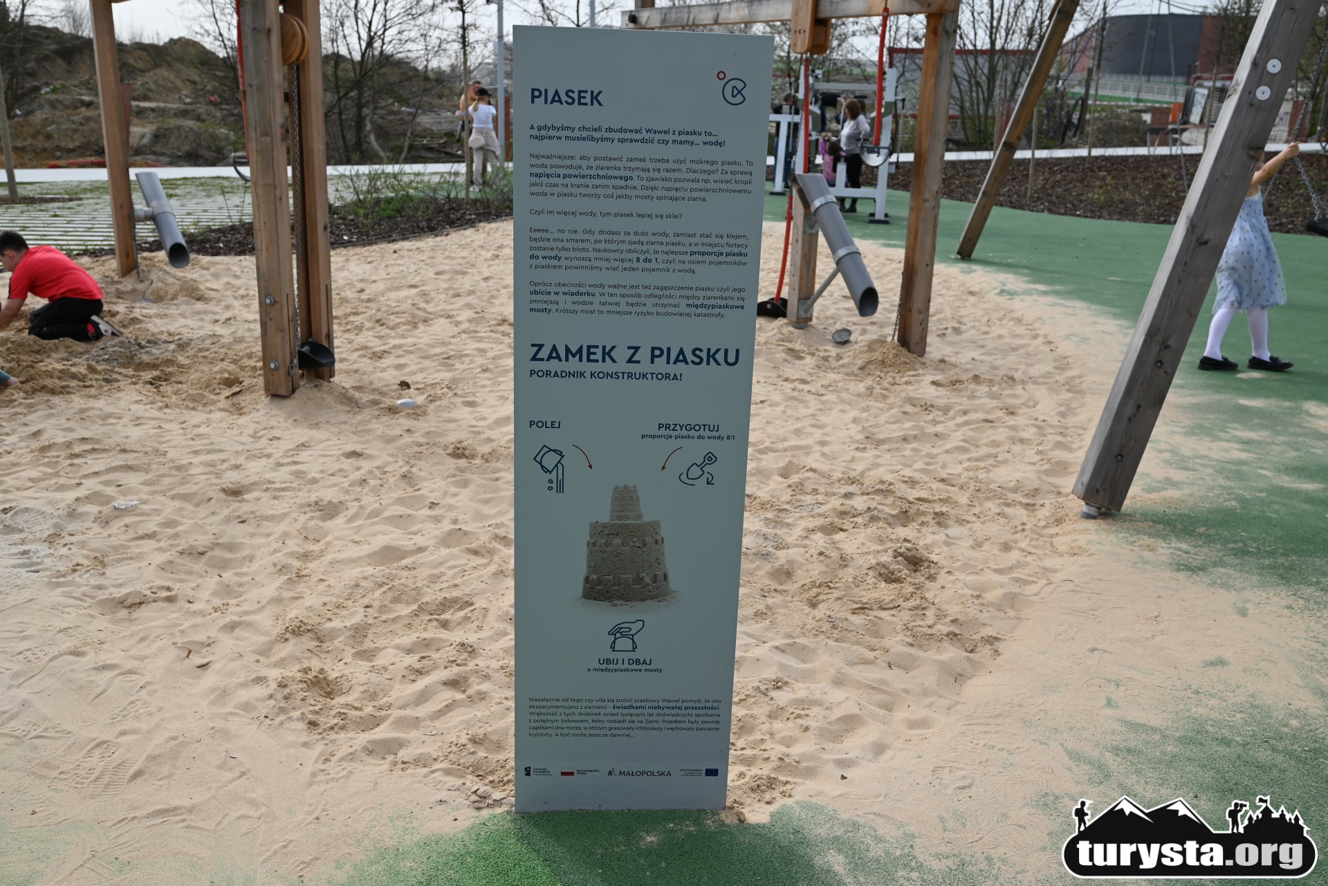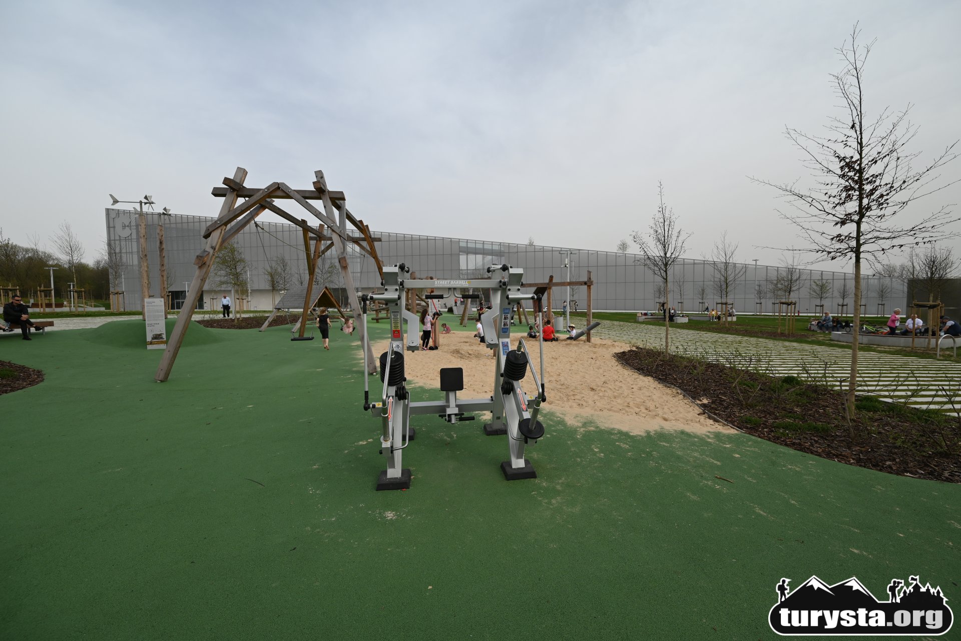 Plac zabaw, wyposażony w innowacyjne atrakcje edukacyjne, takie jak systemy transportu piasku, turbina wiatrowa, różnorodne huśtawki, gniazdo z lin, ławkę solarną, a także elementy wodne i konstrukcje do wspinaczki, został zaprojektowany tak, aby zaspokoić potrzeby dzieci w różnym wieku. Dodatkowo, obok placu zabaw umieszczona została siłownia zewnętrzna, oferująca możliwość aktywnego wypoczynku dla dorosłych.