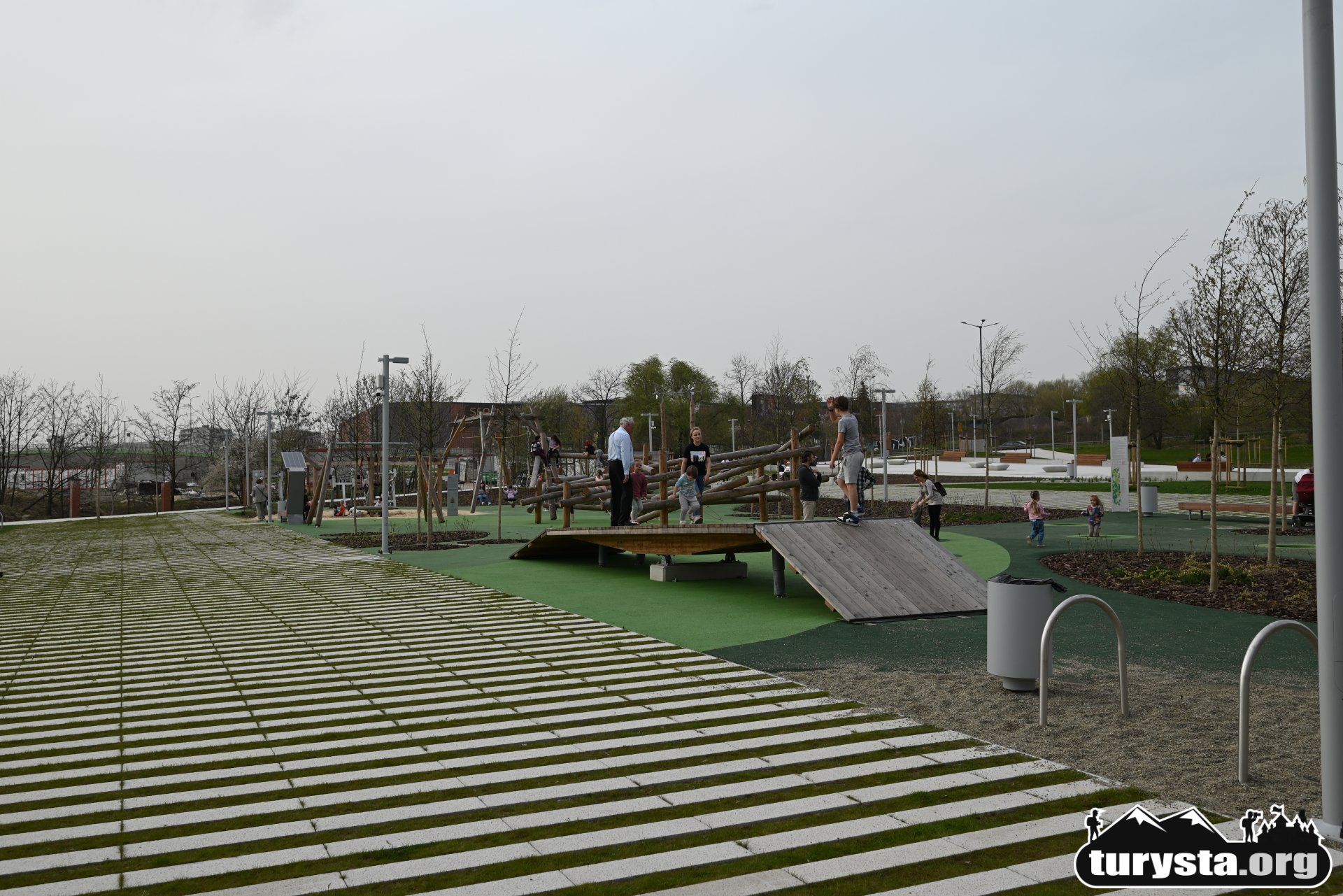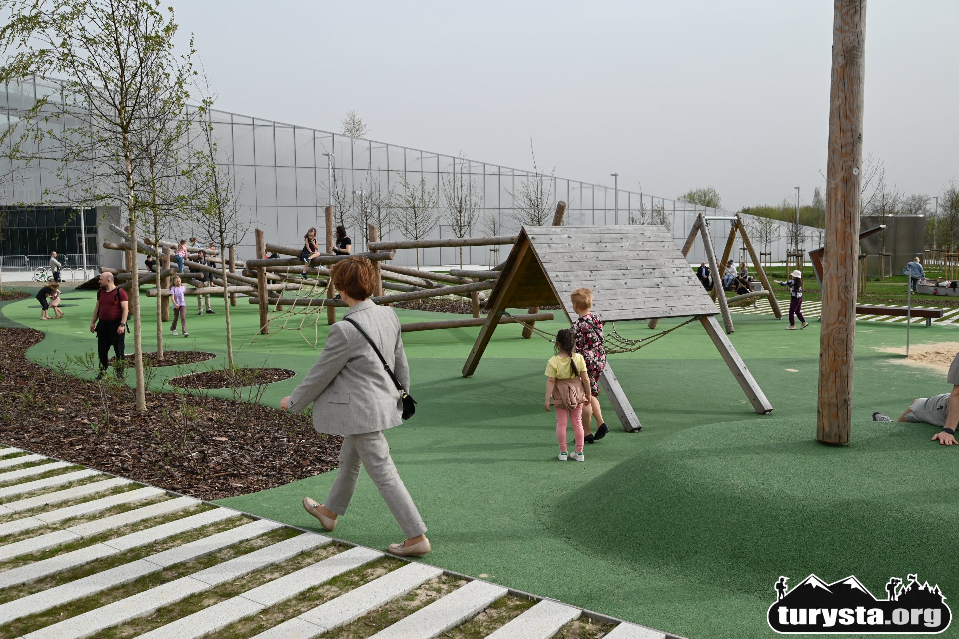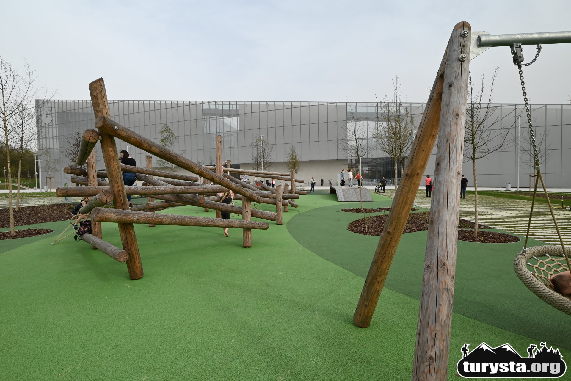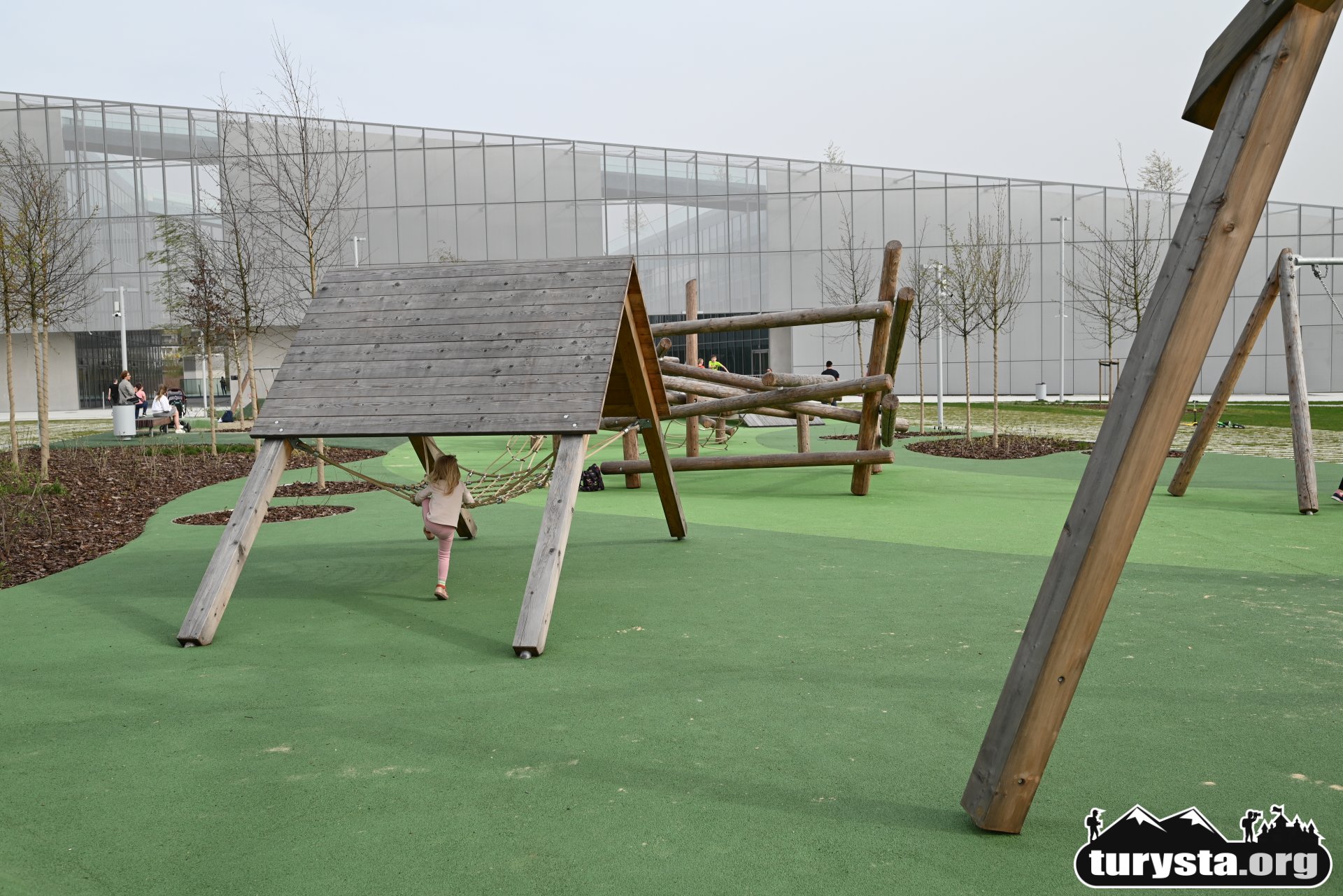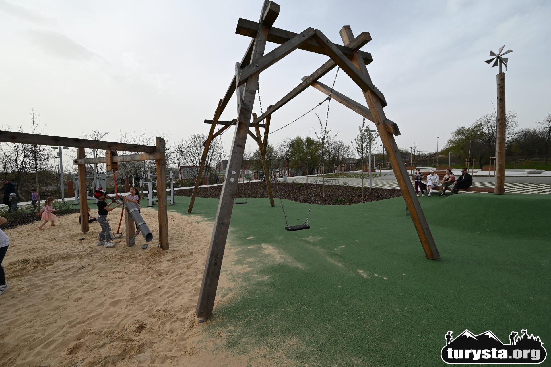 Plac zabaw, wyposażony w innowacyjne atrakcje edukacyjne, takie jak systemy transportu piasku, turbina wiatrowa, różnorodne huśtawki, gniazdo z lin, ławkę solarną, a także elementy wodne i konstrukcje do wspinaczki, został zaprojektowany tak, aby zaspokoić potrzeby dzieci w różnym wieku. Dodatkowo, obok placu zabaw umieszczona została siłownia zewnętrzna, oferująca możliwość aktywnego wypoczynku dla dorosłych.