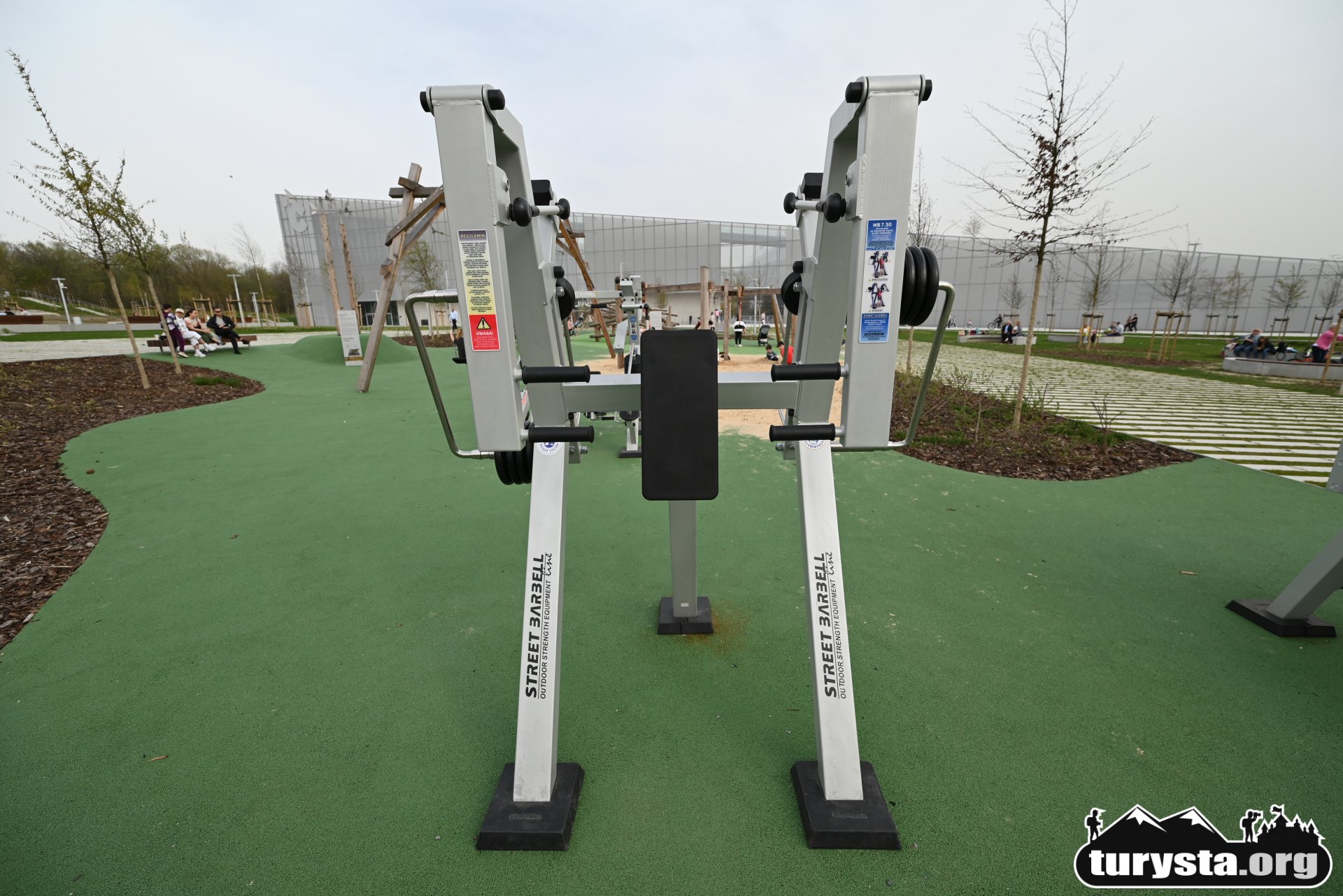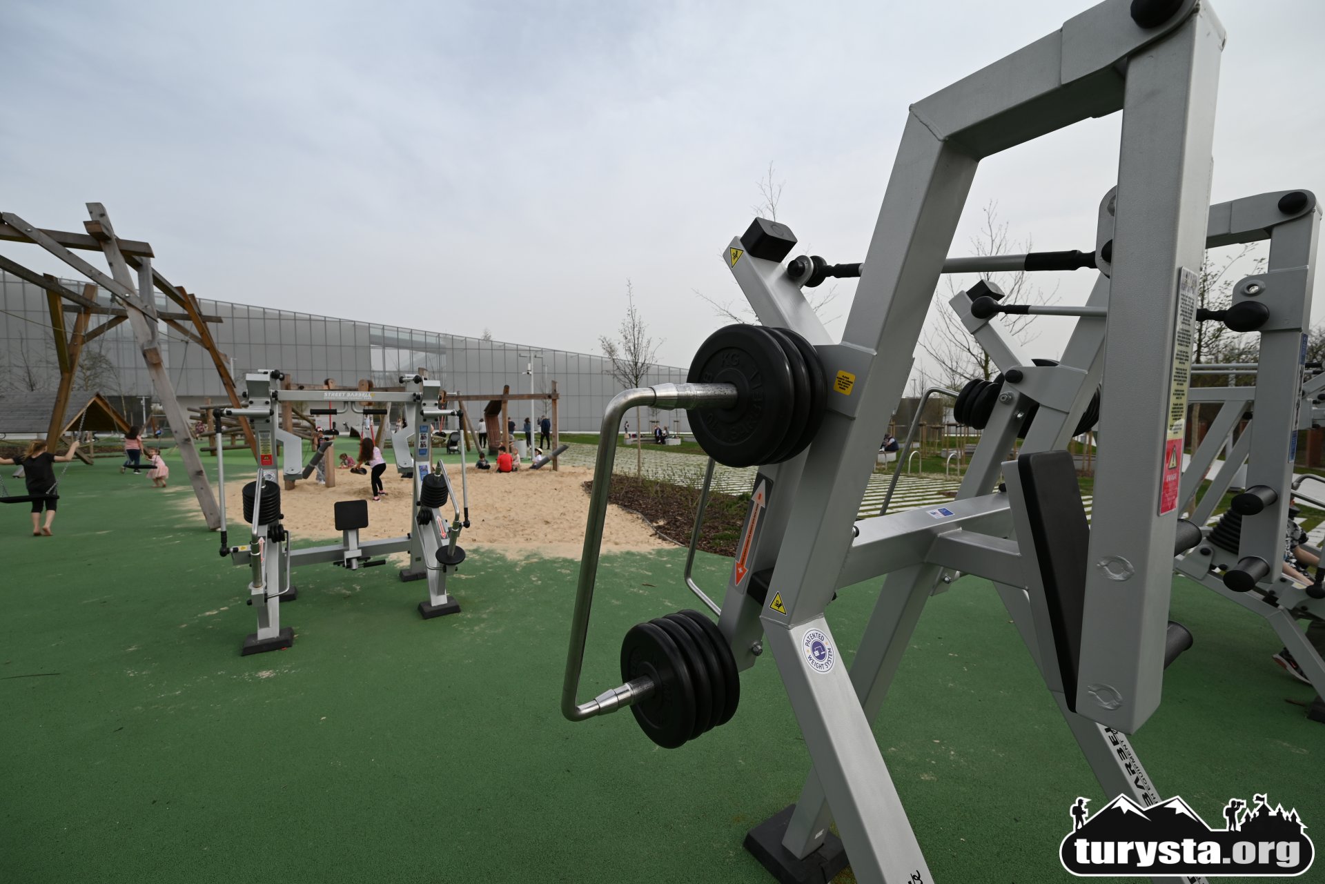 Na samym początku placu zabaw zlokalizowana jest także siłownia zewnętrzna, umożliwiająca ćwiczenia na świeżym powietrzu. To doskonałe miejsce dla rodziców i opiekunów, którzy mogą korzystać z urządzeń do ćwiczeń, jednocześnie będąc blisko bawiących się dzieci. Na siłowni zewnętrznej znajduje się głównie sprzęt do ćwiczeń siłowych, takich jak wyciskanie i podnoszenie ciężarów.
