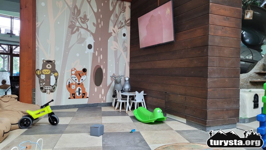 - Kącik zabaw: Bardzo ciekawym i unikalnym miejscem jest kącik zabaw. Gdy dzieci znudzą się, mogą pobawić się przygotowanymi zabawkami lub oglądnąć bajkę.
