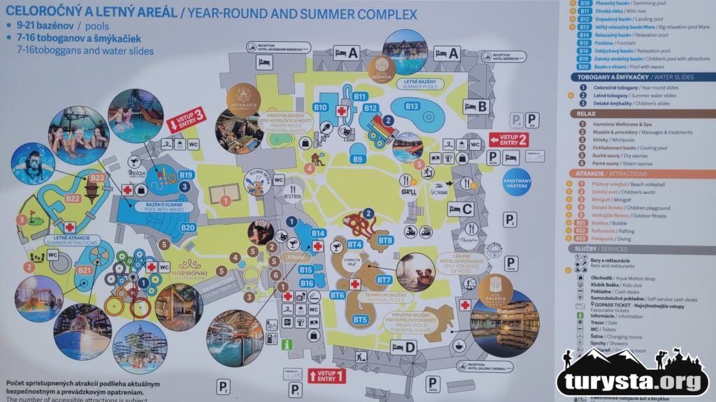 - Miejsca noclegowe: W bezpośrednim sąsiedztwie aquaparku znajdują się hotele: Galeria Thermal Bešeňová****, Hotel Bešeňová*** oraz Hotel Akvamarín Bešeňová ****