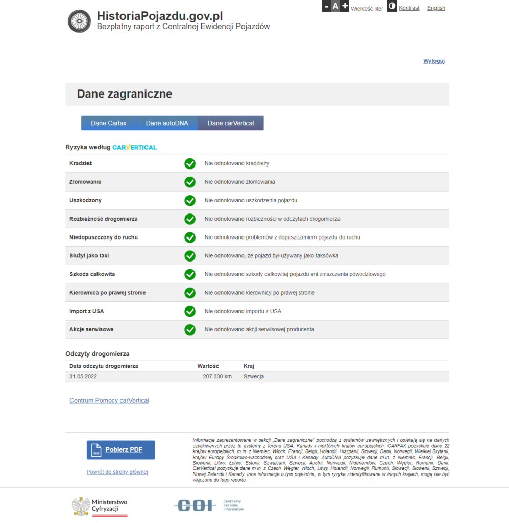 Dodatkowo, zanim zdecydujemy się na zakup, warto skorzystać z usług sprawdzania historii pojazdu poprzez numer identyfikacyjny VIN. Istnieje wiele dostępnych serwisów oferujących takie sprawdzenie online, co pozwoli nam dowiedzieć się o ewentualnych wypadkach, kradzieżach czy przebiegu auta. Warto również skorzystać z darmowej opcji jaką jest rządowa strona: HistoriaPojazdu.gov.pl gdzie po zalogowaniu profilem zaufanym można sprawdzić samochód bez podawania daty pierwszej rejestracji. Sprawdzenie dostępne pod linkiem: https://historiapojazdu.gov.pl/strona-glowna/-/hipo/historiaPojazdu/daneZagraniczne/dane